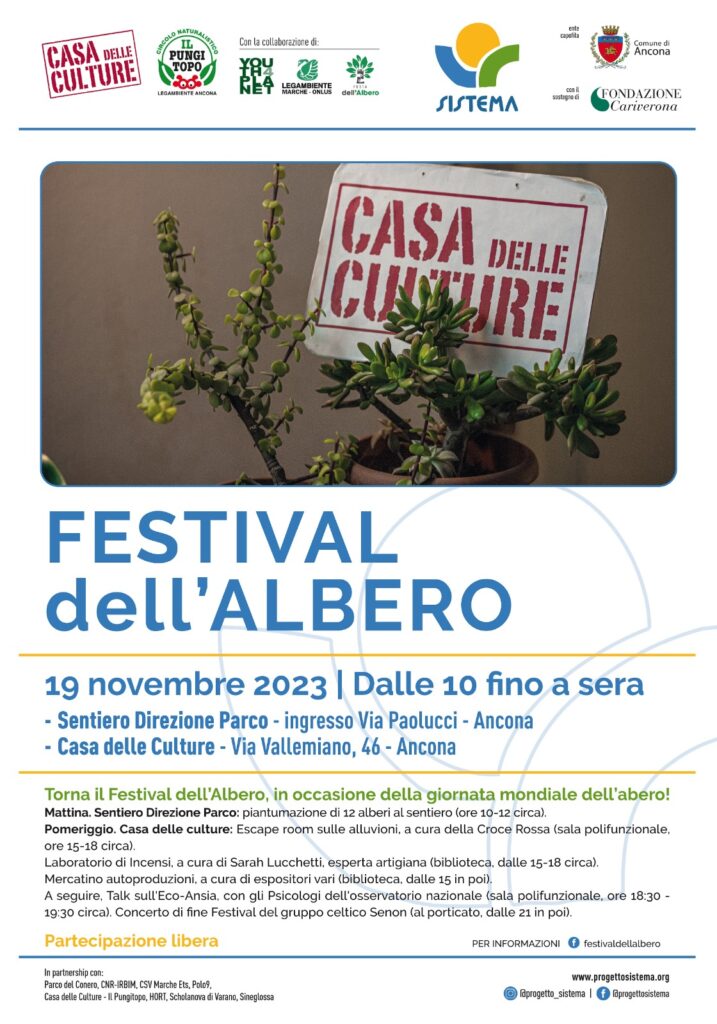 ANCONA – Torna il Festival dell’Albero, in occasione della giornata mondiale dell’albero. Domenica 19 novembre sono numerosi gli appuntamenti previsti tra il Sentiero Direzione Parco e Casa delle Culture, e dunque nel percorso che collega via Paolucci al Parco del Conero, e nell’ex mattatoio di Ancona, oggi biblioteca e luogo di inclusione. Si parte dalle 10 del mattino con le piantumazioni sul sentiero e, tra laboratori e talk a tema, si chiude in serata con il concerto di musica celtica dei Senon.