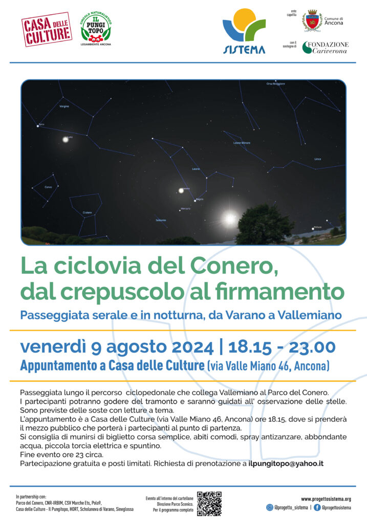 ANCONA – Dal calare del sole alla notte, guidati all’osservazione delle stelle, in una passeggiata lungo il percorso ciclopedonale tra Vallemiano e il Parco del Conero. È la nuova iniziativa di Direzione ParcoScenico, la serie di appuntamenti organizzati da Casa delle Culture di Ancona e il circolo di Legambiente il Pungitopo, lungo il sentiero Direzione Parco e supportata da Sistema, il progetto promosso dal Comune di Ancona, Irbim Cnr, Csv Marche, Polo9, Hort, Casa, Casa delle Culture – il Pungitopo, Scholanova di Varano, Sineglossa con il sostegno di Fondazione Cariverona.